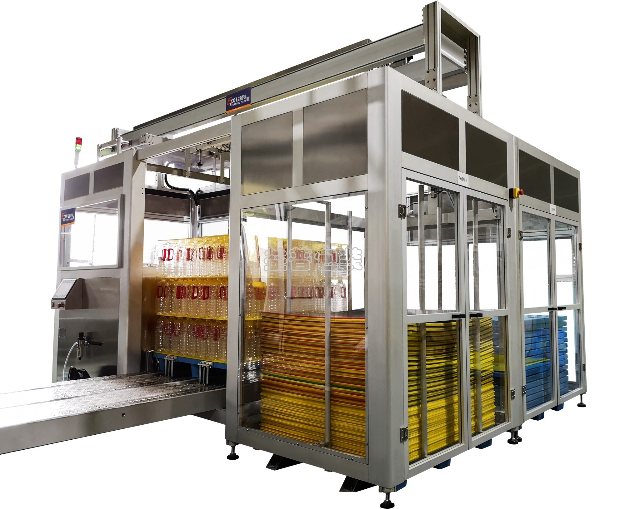 It is composed with bottle infeed conveyor, mechanical gripper, layerboard & pallet storage & supply system. During machine running, pallet has been transferred into machine. It will automatic