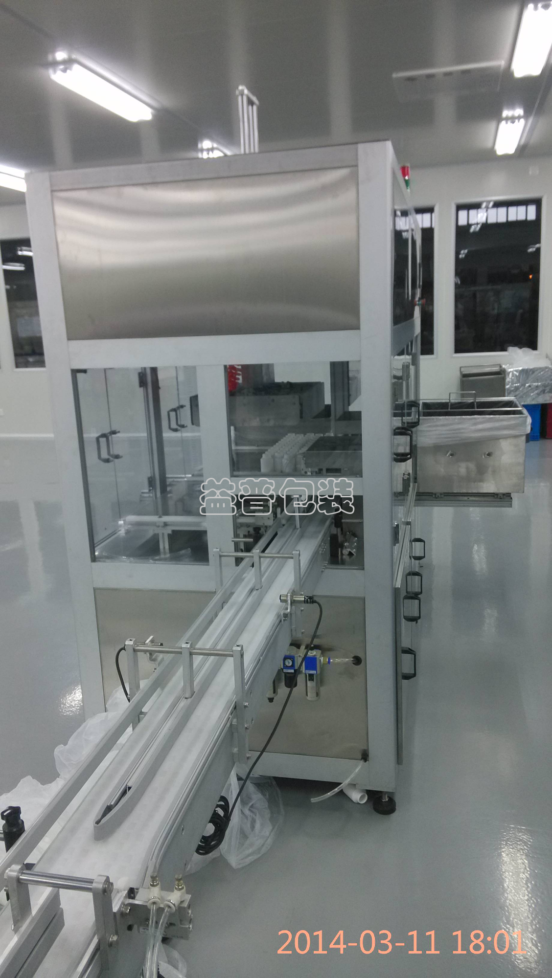 產品由進瓶輸送線送入排瓶推移工位,排瓶推移機構將整排推入排瓶臺。達到設定的行列數時,抱夾升降平移機械手將整層瓶抱夾裝入周轉箱中的塑料袋內。裝滿設定的層數后,人工將套好袋的空周轉箱推入裝袋工位,同時滿箱將推至取出工位,工人完成封口后將滿袋取出。并重新套上空袋。周轉箱套袋、滿袋封口及從周轉箱取出由人工完成,只需一人操作。