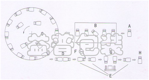 Empty bottle automatic placed in hopper B-àbottle lifting to a rotary table to gain rotating speed at Cà empty bottle at D&F in vertical positionàbottle outfeed at H.