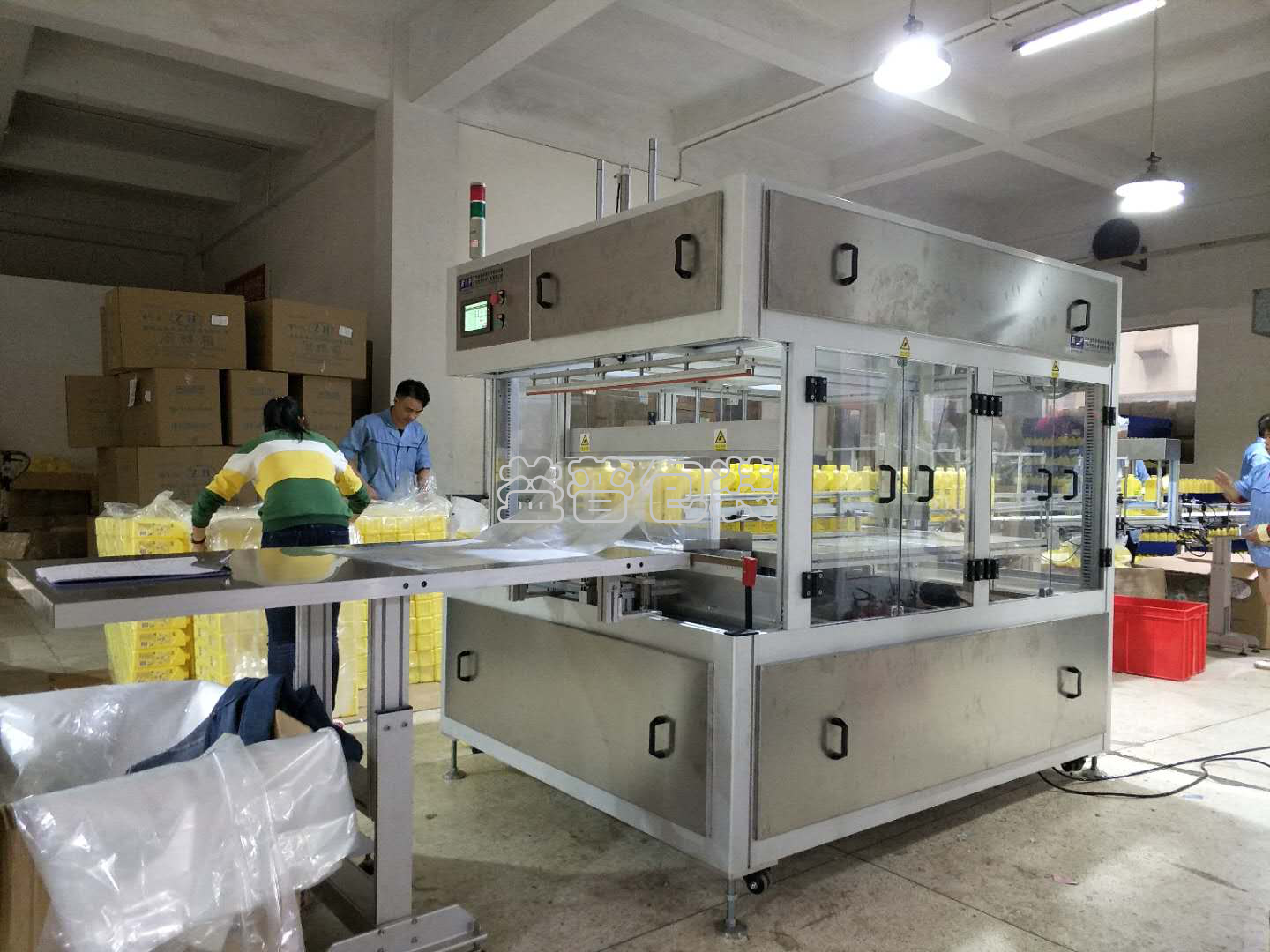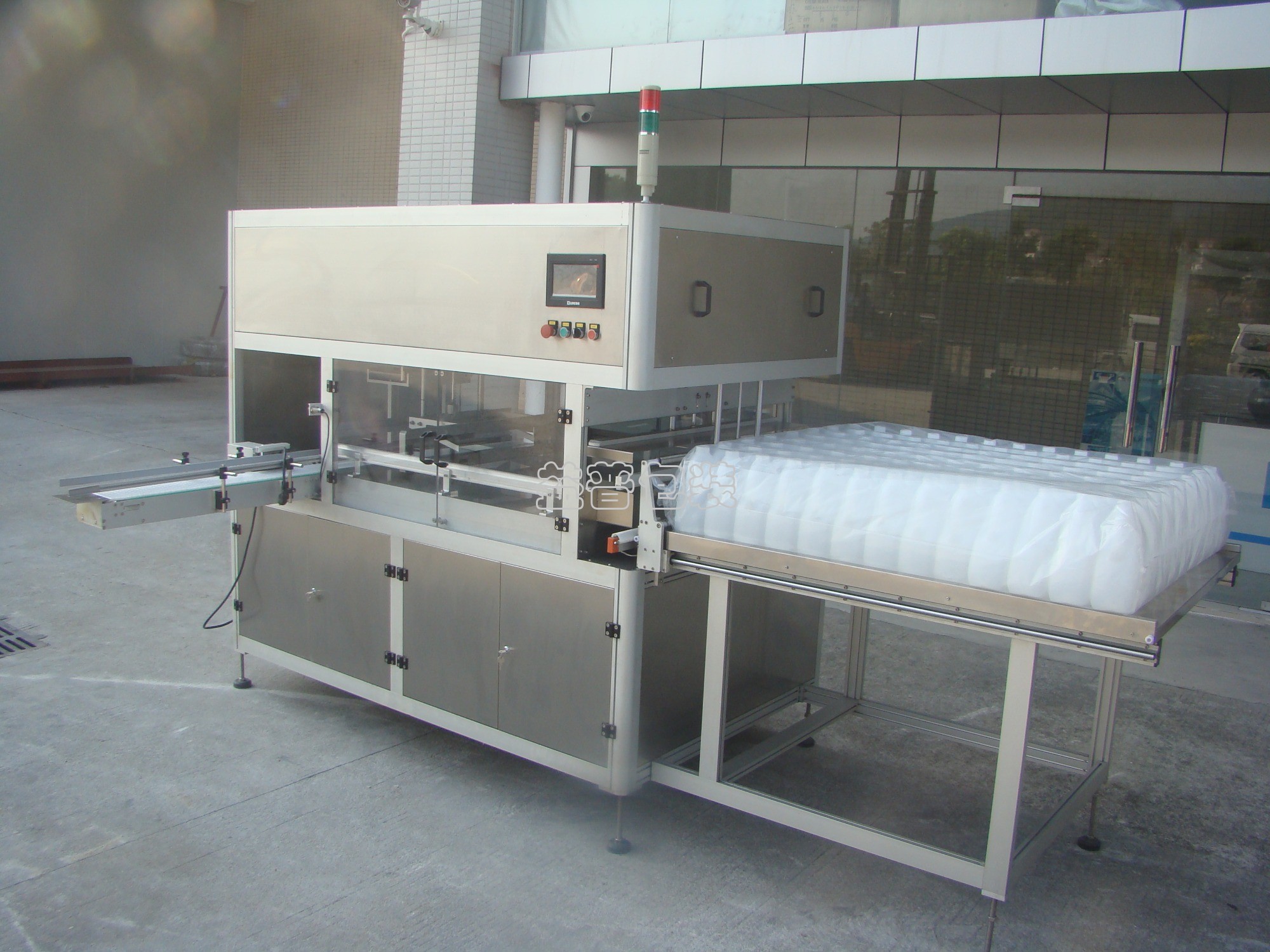 Through operator to place an empty bag on outfeed area, bottle will form a matrix in machine and will be push into bag once finishing matrix. Bag mouth will be sealed automatically.