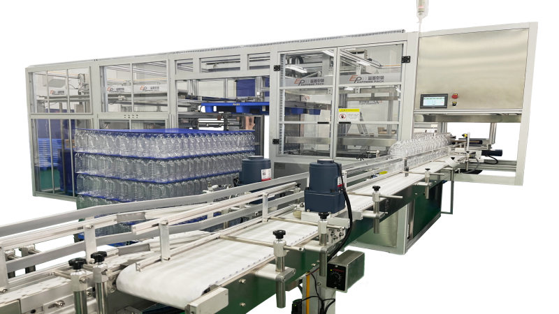 主機由進瓶輸送線,計數排瓶裝置、移載裝置、隔板及垛板自動供給裝置,及垛板進出輸送...
